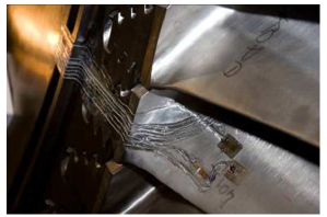 OROS分析仪激活17个输入通道,分别连接14个应变片,1个热电偶,1个电磁激励和1个转速探头。1个滑环和1个1/4桥应变放大器。通过交直流转换,实现动态和静态激励。 |
