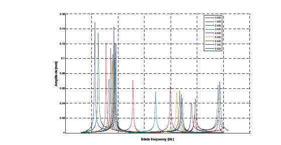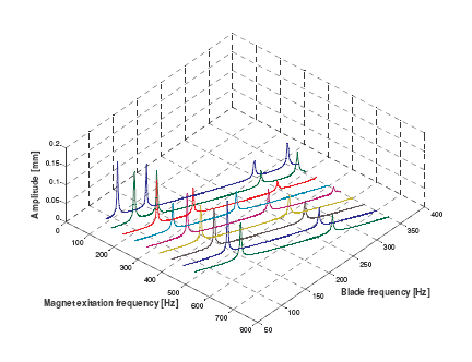 在100~250Hz之间,大多数电磁激励频率都可以激出固有频率以及高次谐振。在250~450Hz之间,响应的共振频率峰值多有重叠,此时,需要使用FFT把叶片的不同固有频率分离出来。