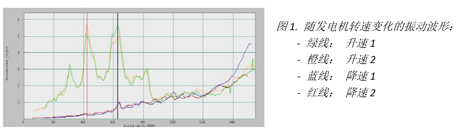 设备配置好后,对2套连续序列的发电机组做了升降速工作状态的试验性测试,结果非常成功。下图1中的曲线表示传动系统的振动情况。振动量级采用了减速齿轮箱垂直方向的振动数据。