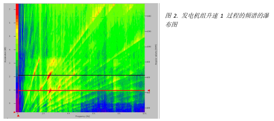 OROS分析仪的瀑布图功能可以分析出振动能量在整个过程中的频率分布,还可以确定危险频率的阶次,在图2中已黄色射线表示出来。该图包含了发电机运行的大量信息,可被用于故障诊断和维修预警。